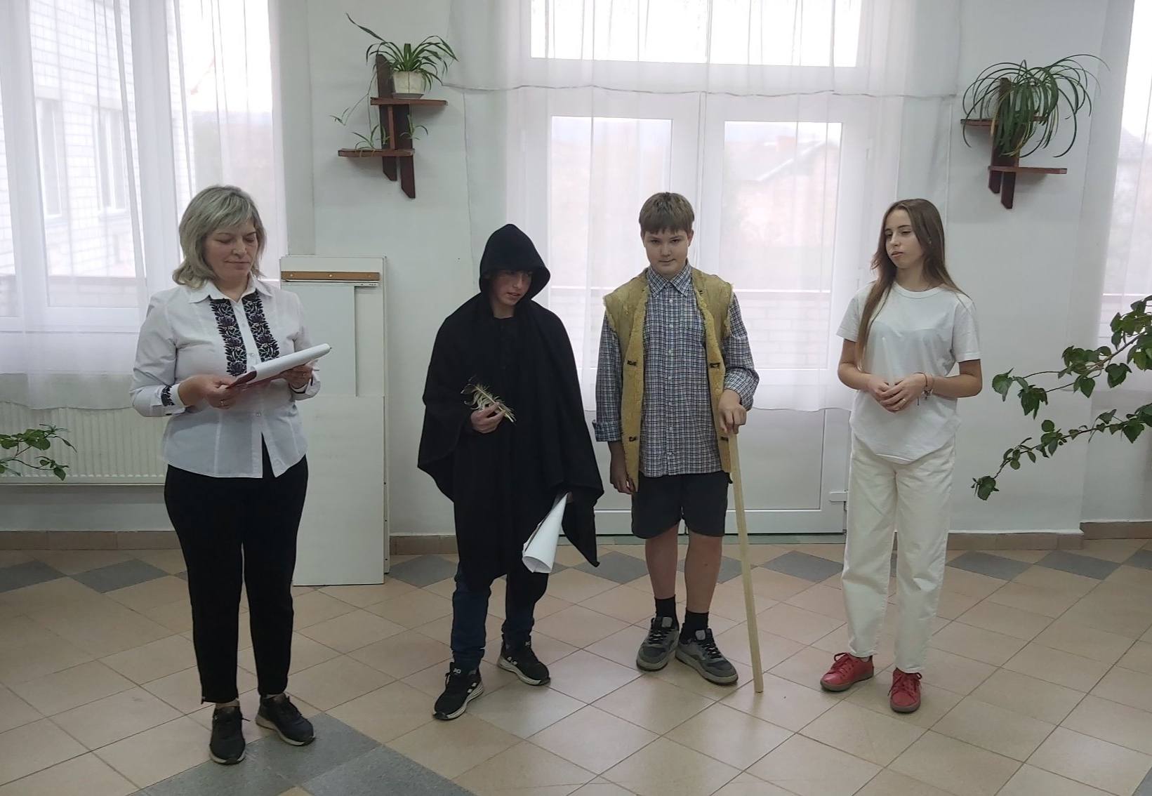 У цьому виступі йшлося про те, як до людей прийшло Слово, звучали полум’яні віршовані рядки, був і “Нестор Лтописець” (Криховецький Святослав), і сучасні школярки (Плюдра Софія та Мінчак Марія), і “давня людина” (Єременко Костянтин), і саме “Слово”( Файфер Софія), і Україна (Янко Іванка). А завершився захід чудовою піснею у виконанні Фегецин Ярини.